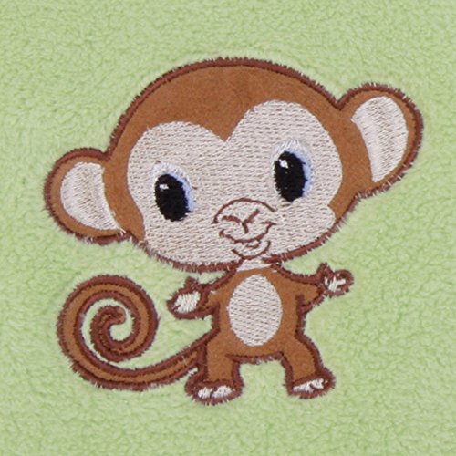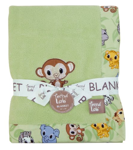 -. Feature : Double-sided blanket with a plush, animal theme / Animal P.R.Int border / monkey embroidered applique / Blanket measures 30L x 40W inches