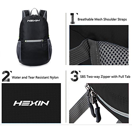 -. Brand : HEXIN -. Department : Unisex -. Feature : INCOMPARABLE BEST QUALITY: Made from High Quality Water and Tear Resistant Nylon Material, durable Abrasion Resistant SBS Metal Zipper available. Reinforced more than 15 places with Bartack Process for its longevity. / KEEP THINGS ORGANIZED: Three zippered compartments. Main pocket is Large enough to carry what you need. Outer smaller pocket great for quick access such as guide books and camera. Inner zippered pocket which doubles as the storage pouch is perfect for valuables such as cash, credit cards and passport. Two large side mesh pockets for water bottles or umbrella. / LIGHT WEIGHT (0.35 LB) and Roomy (20 Liter) : Perfect for day trips, vacation, travel, day hikes, school, camping and shopping.Unfold: 18*12*5.5 inch Fold:6x6 inch. / COMFORTABLE TO CARRY: More than 10 Years Experience makes the Most Comfortable Wide Breathable Mesh Shoulder Straps. Easy to Adjust the length to lock firmly. High quality SBS Two-way zipper goes smoothly. / CONVENIENT AND LIGHTWEIGHT: It folds into an ultra-compact pouch. Easy to put it in a small pocket (Sandwich size),especially in your suitcase for your excess baggage at your destination as an extra bag to avoid Paying Overweight Baggage Fee! -. ProductGroup : Apparel -. ProductTypeName : LAGE -. Title : HEXIN Lightweight Packable Small Waterproof Daypacks for Camping Travel Hiking