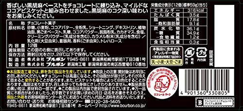 原材料:砂糖、小麦粉、ココアバター、全粉乳、ショートニング、デキストリン、植物油脂、黒ごまペースト、乳糖、ココアパウダー、脱脂粉乳、カカオマス、食塩、クリーミングパウダー(乳成分を含む)、カラメル粉末(乳成分を含む)/乳化剤(大豆由来)、膨脹剤、香料(ごま由来)、トレハロース