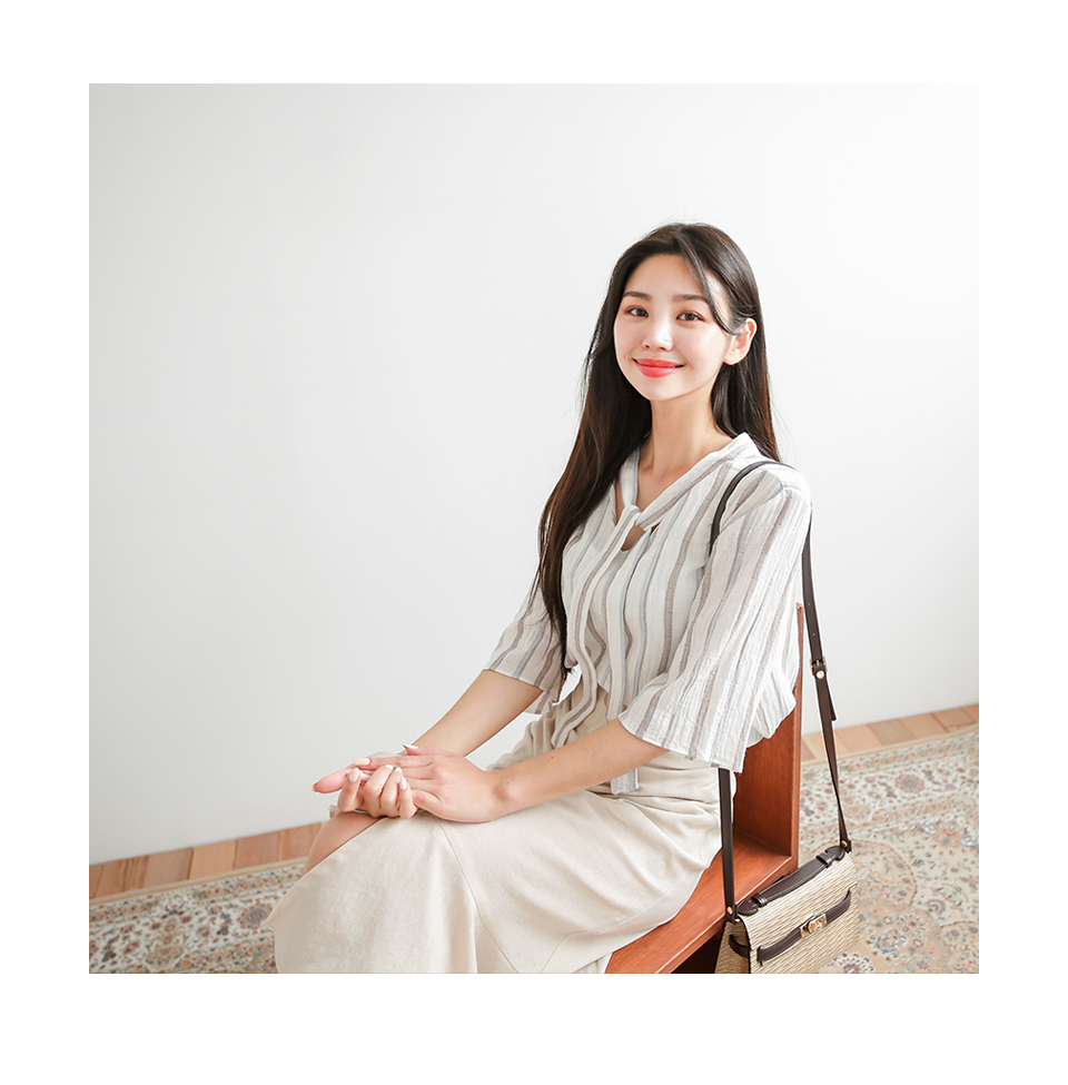은은한 패턴과 타이 디자인으로 여성스러움을 강조해주는 블라우스!