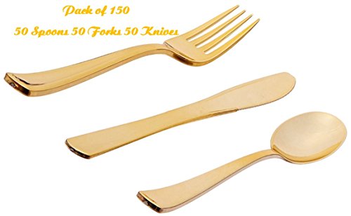 Green Direct Gold Plastic Cutlery Set, 50 Knives, 50 Forks, 50 Spoons, Combined Pack Ready to Serve 50 Guest