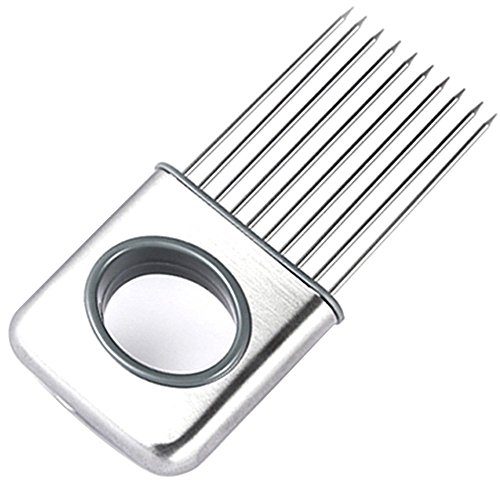 Material: Stainless steel + ABS, This handy gadget not only holds the onion for you (no more stinky hands), but also guides your knife for perfectly even slices. If you do not want to touch onion, this gadget will be a great solution.