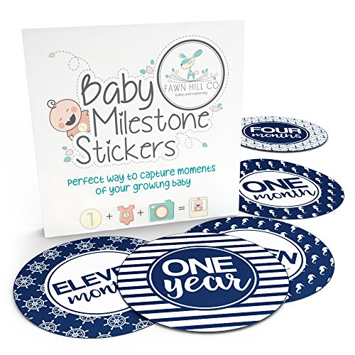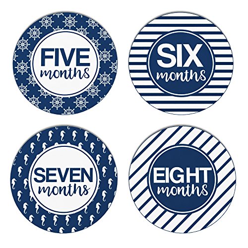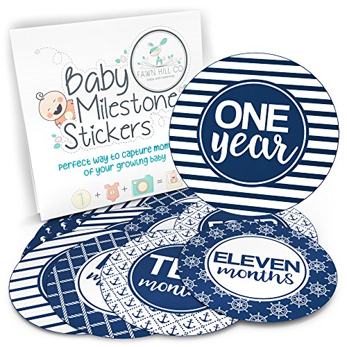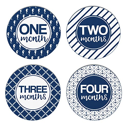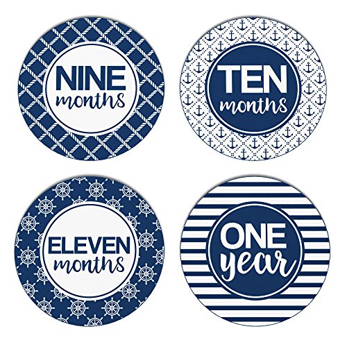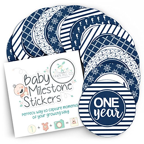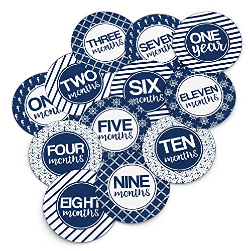 Baby Monthly Stickers for Onesie or Scrapbook - 12 Nautical Patterns Unisex Milestone Month Stickers for Your Baby's First Year Growth - Boy or Girl
