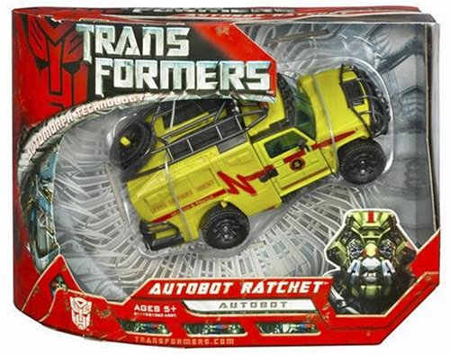 -. Binding : Toy -. Brand : Hasbro -. EAN : 0653569111054 -. Feature : AUTOBOT robot-to-vehicle figure features an AUTOMORPH forearm cannon / Vanity is not a fault from which RESCUE RATCHET typically suffers / He's never paid much attention to the decorations adorning his vehicle mode however / His new paint job helps him fit in, and allows him to help more humans than ever before / Plus, these new decorations just seem more natural somehow / Also features a hidden axe in robot mode, and a roof rack that converts to a shield or combat stretcher in Hummer H2-mode / After discovering the tendency for human rescue vehicles to be decorated in certain ways, he started paying more attention to his appearance / He is more concerned with saving the lives of his fellow AUTOBOTS than with what they think about him -. IsAdultProduct : 0 -. IsAutographed : 0 -. IsMemorabilia : 0 -. Label : Hasbro -. Manufacturer : Hasbro -. Model : 81119 -. MPN : 0653569111054 -. PackageQuantity : 1 -. PartNumber : 0653569111054 -. ProductGroup : Toy -. ProductTypeName : TOYS_AND_GAMES -. Publisher : Hasbro -. ReleaseDate : 2007-06-02 -. Studio : Hasbro -. Title : Transformers Movie Voyager Autobot Ratchet -. UPC : 653569111054