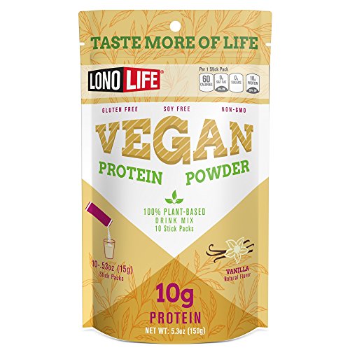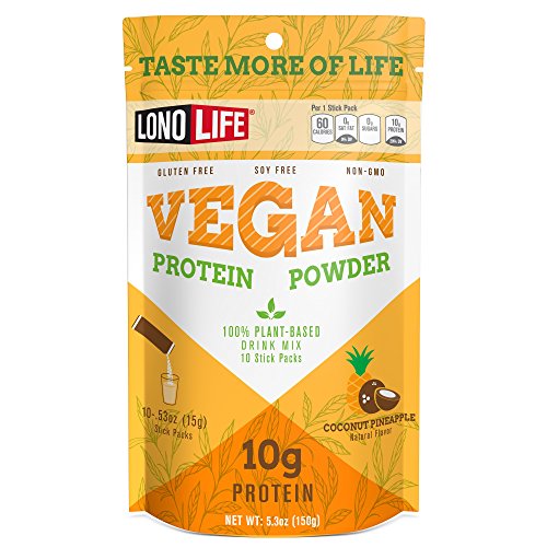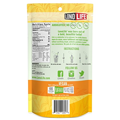 Great for vegetarians, vegans, and anyone focused on a healthy diet, LonoLife's delicious Vegan Protein offers 10 grams of plant-based protein in each serving. Stir or shake into 8 ounces of cold water or blend into a smoothie. With no added sugars, it's ideal for low-carb, low-sodium dieters and anyone who can use a boost of protein when crunched for time at home, at the office, in a college dorm, or on the road. Offering naturally smooth, clean nourishment and easy portability, LonoLife Vegan Protein is crafted from a unique blend of plant-based ingredients that is super soluble - no gritty aftertaste and no more undissolved particles at the top of your smoothie. LonoLife Vegan Protein doesn't require mixing or blending - just stir into with water, juice, or your favorite milk and enjoy. LonoLife Vegan Protein is available in convenient on-the-go, single-serve Stick Packs as well as a scoopable 8-ounce container that provides 19 servings. It contains no artificial colors, sweeteners, preservatives, or flavors, and no added sugar. It is also soy free, dairy free, gluten free, wheat free, and non-GMO. LonoLife Vegan Protein has 10 grams of protein, 2 grams of carbohydrates, 0 grams of fiber, and 140 mg of sodium per serving. Ingredients include: Protein blend (pea protein, rice protein, faba bean protein), natural flavors, xanthan gum, sea salt, stevia. Started by a team that includes recreational surfers, a former professional wakeboarder, a CrossFit junkie, and an avid runner, LonoLife creates healthy, Paleo-friendly bone broth soup snacks that are convenient for busy, active, and healthy lifestyles.Feature
