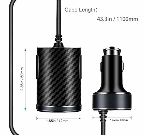 4-Port USB passenger car charger with 43.3inch/110cm extension cable and 2-port charging station hub for front and back seat passengers.