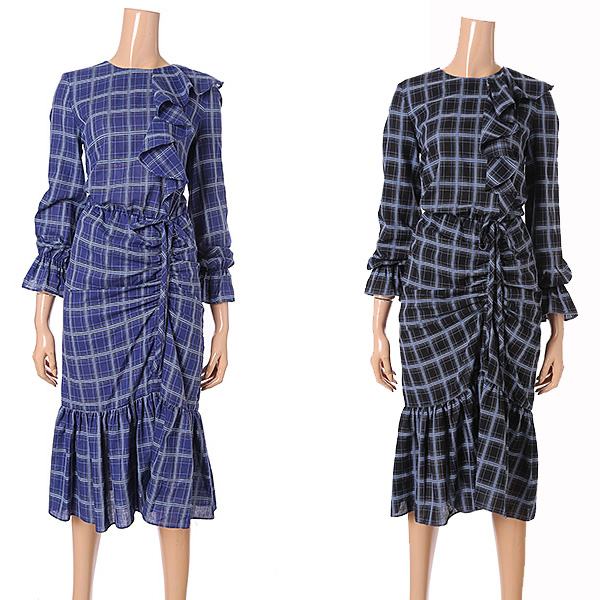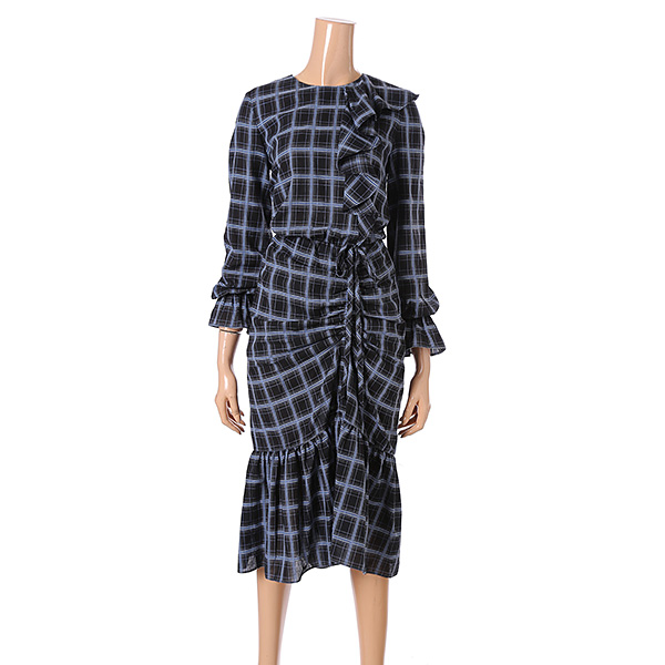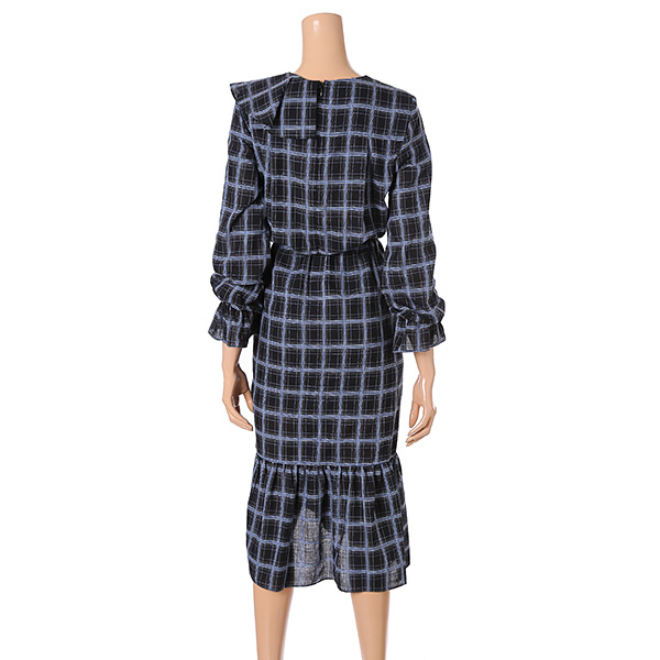블랙 컬러에 체크패턴과 러플장식으로 포인트를 준 원피스 입니다. 허리 밴딩 디테일로 편안하며 러플장식으로 여성스러움이 돋보이는 아이템 입니다.