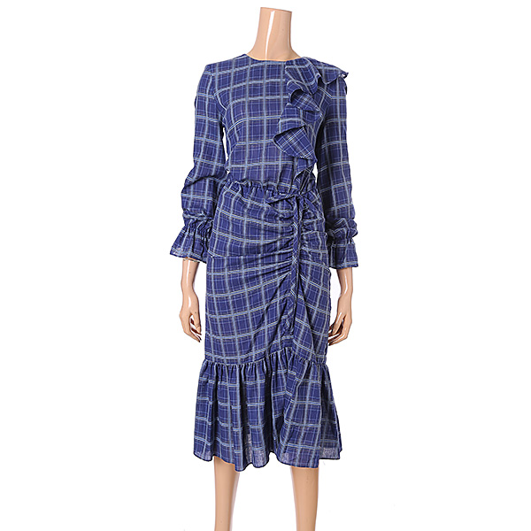 블루 컬러에 체크패턴과 러플장식으로 포인트를 준 원피스 입니다. 허리 밴딩 디테일로 편안하며 러플장식으로 여성스러움이 돋보이는 아이템 입니다.