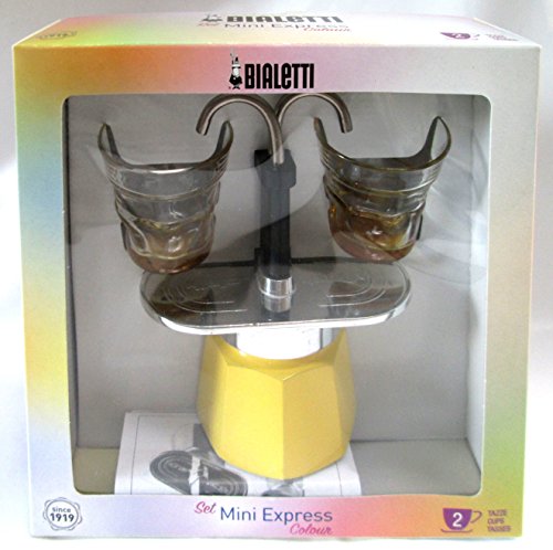 BIALETTI: SET MINI EXPRESS COLOUR 2-CUPS YELLOW + 2 BIALETTI TRANSPARENT COFFEE GLASSES WITH YELLOW BOTTOM [ ITALIAN IMPORT ]