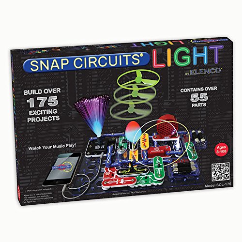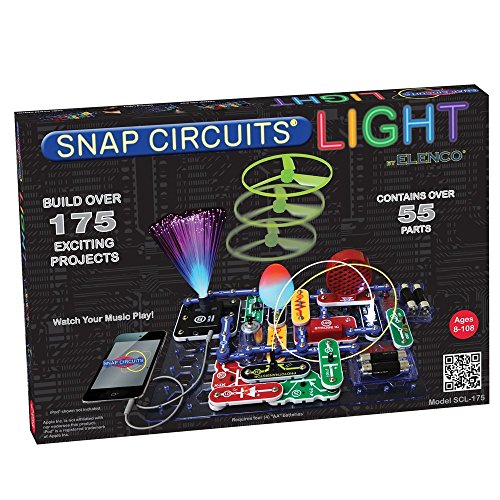 Watch and be amazed at what your music can do with Snap Circuits® Light?it makes learning about light and its properties easy and fun. Connect any MP3 player to enjoy your music and a light show. Explore and experiment with color-changing LEDs, strobe lights, and fiber optics. Set comes with more than 55 pieces that are mounted on plastic modules and snap together with ease; no tools are required. Just follow the colorful pictures in the manual to build over 175 exciting projects, including: - Infrared Detector