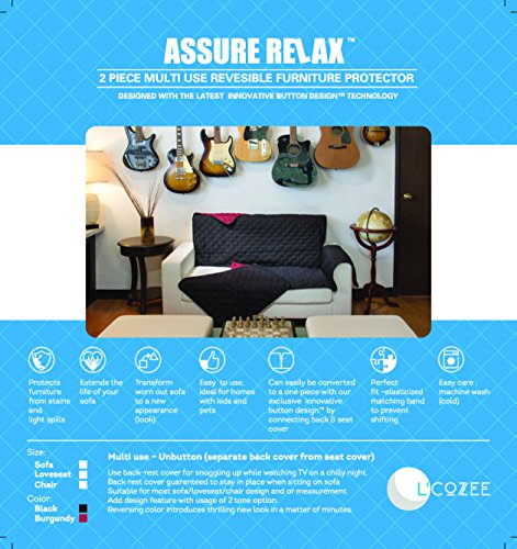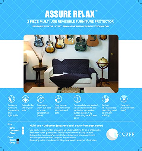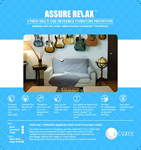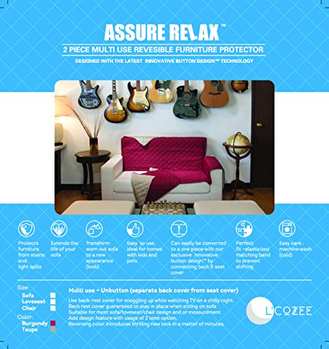 -. Feature : THE ASSURE RELAXTM 2 Piece REVERSIBLE Sofa Cover With Button On Button Off Option For 1 Piece Or 2 Piece OPTION. The 2 piece consists of (1 piece is seating area and arm rest and 1 piece is for back rest) / The 2 piece was designed so that the back rest and seating area are separately placed onto the sofa, so that when you sit & sink into the sofa or take a nap the back rest wont pull off or shift in its place. / Be creative for bold colored looks with option of a 2 tone sofa, or a throw while snling on sofa to watch TV and late night cuddles. / Reversible furniture protector will protect your new and old sofa and give a bold new look, It will protect from stains, light spills, pets and more and will surely extend the life of your sofa.Uniquely made with double diamond quilting for extra comfort and sophisticated look. / CARE: Machine Wash / Dry