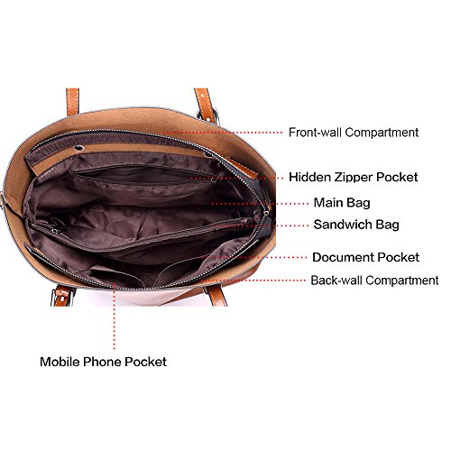 - ✔LARGE CAPACITY: All things could be placed well! 2 large compartments are about the same size as A4, a central zip pocket for cosmetic and other daily items, 1 hidden zip pockets for wallet and another 2 pockets for keys / cards.