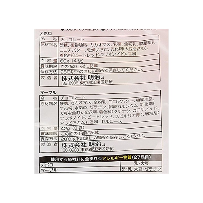 원재료:【마블】고, 설탕,카카오 마스,전분유,코코아 버터,식물성 기름지,나오지 않겠 분,물엿,젤라틴,난각 칼슘,유화 제,(대두를 포함한다)고, 광택 제,착색료(치자나무,카로 치노 이 드,후라보노이드,비트 레드,《스피루리나》청)고, 증점제(아라비아 껌)고, 향료,셀룰로오스【아폴로】고, 설탕,식물성 기름지,카카오 마스,유당,전분유,탈지분유,코코아 버터,건조 딸기,유화 제(대두를 포함한다)고, 착색료(비트 레드,후라보노이드)고, 향료