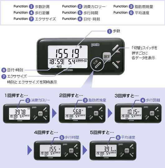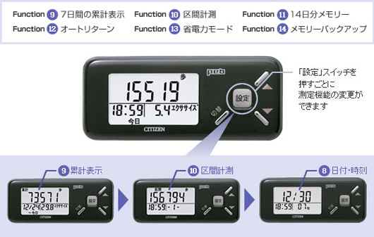 どの画面を表示していても、約10秒間スイッチを押さないと、歩数表示画面に自動的に戻ります。