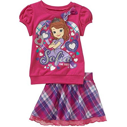 -. Binding : Apparel -. Brand : Disney -. Color : Pink -. Department : baby-girls -. Feature : Glitter graphic detail on front / Ruffle short sleeve Bow detail on front / 60% Cotton, 40% Polyester -. PackageQuantity : 2 -. ProductGroup : Apparel -. ProductTypeName : SKIRT -. Title : Sofia the First Princess Baby Toddler Girl Tee and Skirt Outfit Set