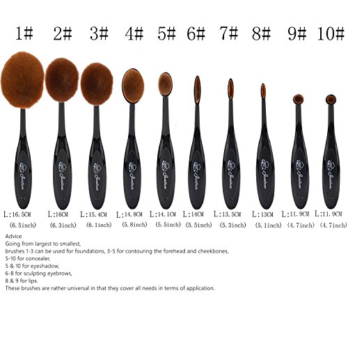 Going from largest to smallest, brushes 1-3 can be used for foundations, 3-5 for contouring the forehead and cheekbones, 5-10 for concealer, 5 and 10 for eyeshadow, 6-8 for sculpting eyebrows, and 8 9 for lips. These brushes are rather universal in that they cover all needs in terms of application.