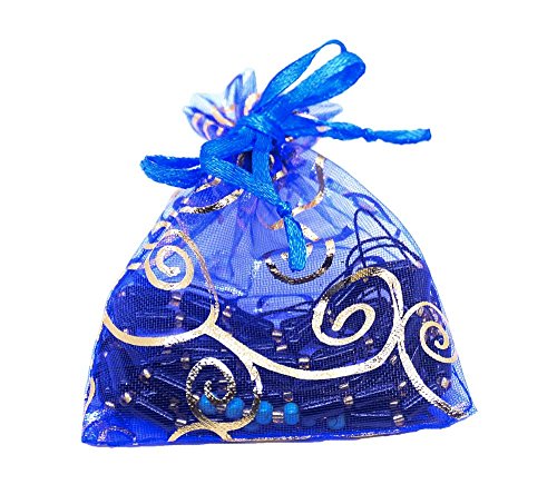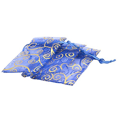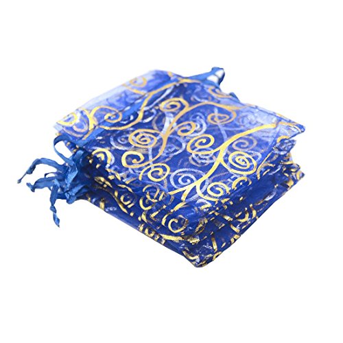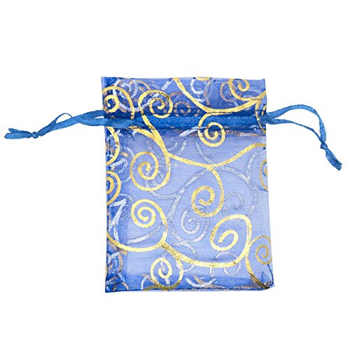 SUNGULF 100Pcs Sheer Organza Drawstring Pouches Vine Wedding Gift Bags 3x4 Inches (Blue Gold)