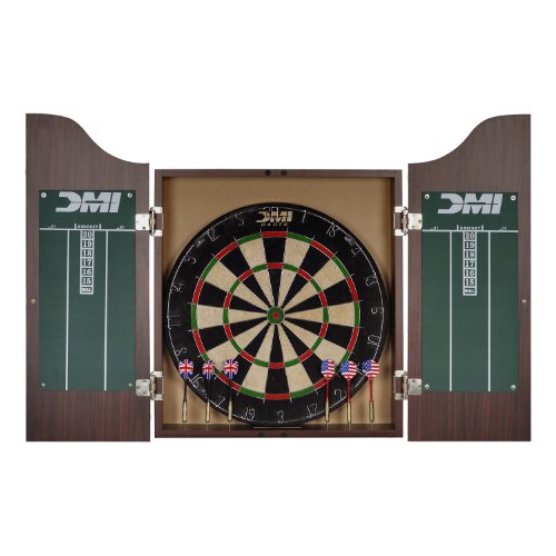 - Feature : Beautiful rustic wood finish / Includes official size dartboard / 6 darts / Deluxe self closing brass hinges / Finger joint frame construction