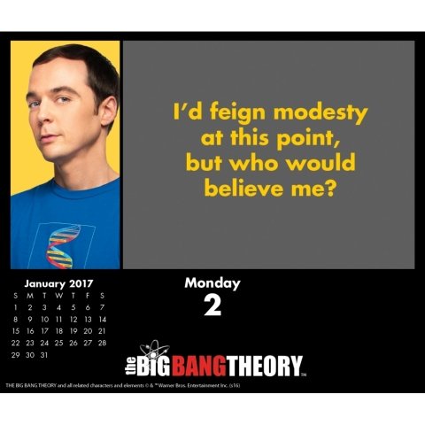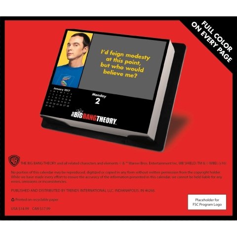 -. Binding : Office Product -. Brand : Calendar 2017 Boutique -. EAN : 0712411767891 -. Feature : The Big Bang Theory Calendar 2017, Box Edition -- Deluxe Day-at-a-Time Big Bang Theory Box Calendar (6x5x2). / Big Bang Theory Day-at-a-Time box calendar features full-color, page-a-day designs (Saturday/Sunday combined) and a sturdy, self-standing easel. / Featuring more than 300 photos from The Big Bang Theory show. / This Big Bang Theory 2017 desk calendar observes major holidays and moon phases. / The perfect gift for the desk and office of any Big Bang Theory fan. -. Label : Calendar 2017 Boutique -. Manufacturer : Calendar 2017 Boutique -. Model : Big Bang Theory Calendar -. MPN : Big Bang Theory Calendar -. PackageQuantity : 1 -. PartNumber : Big Bang Theory Calendar -. ProductGroup : Office Product -. ProductTypeName : OFFICE_PRODUCTS -. Publisher : Calendar 2017 Boutique -. Studio : Calendar 2017 Boutique -. Title : The Big Bang Theory Calendar 2017 -- Deluxe Day-at-a-time Box Calendar Desk (6x5x2) -. UPC : 712411767891