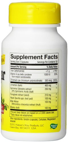 -. Binding : Health and Beauty -. Brand : Nature's Way -. Feature : Contains GTF Chromium, part of the glucose tolerance molecule that is an important cofactor for insulin. / Blend of current scientific research and traditional herbal medicine. / Contains Gymnema standardized extract, the Ayurvedic "sugar destroyer." and a blend of herbs and carotenoids with supportive properties. -. Label : NATURE'S WAY -. Manufacturer : NATURE'S WAY -. PackageQuantity : 1 -. ProductGroup : Health and Beauty -. ProductTypeName : HEALTH_PERSONAL_CARE -. Publisher : NATURE'S WAY -. Studio : NATURE'S WAY -. Title : Blood Sugar w/ Gymnema Extract