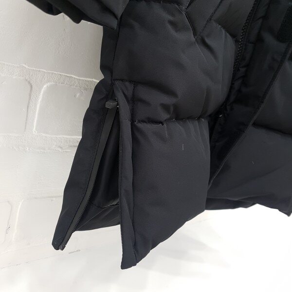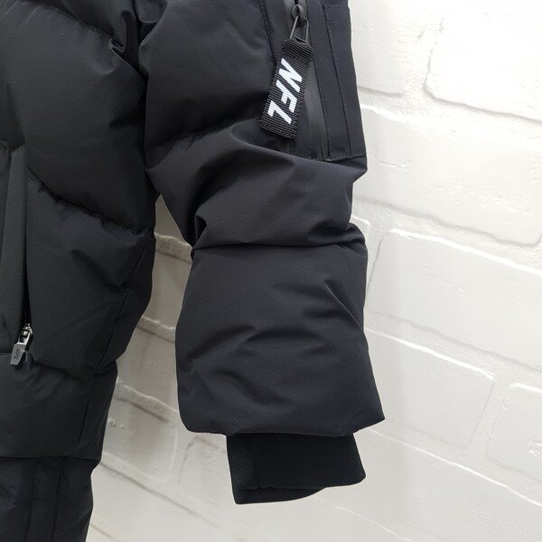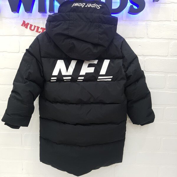 엉덩이 덮는 기장이며,후드 탈부착이 가능한 오리털,소매 포켓의 레터링 테잎과 뒤 나염이 트렌디한 아이템 에리안과 포켓안에 라이렉스 기모를 넣어주었으며 소매 끝단에 시보리를 달아주어 따뜻한 밑단 양쪽에 지퍼를 달아주어 활동이 편함,몸판 안쪽에 부착된 네임텍에 이름,연락처 기재가능