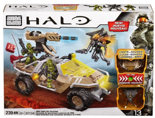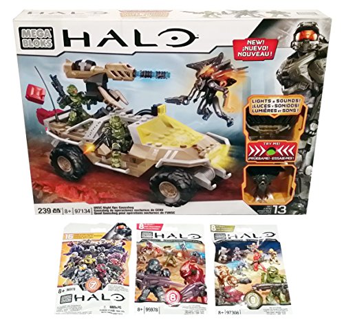-. Feature : Mega Bloks Halo UNSC Night Ops Gausshog (97134) + Series 7, Series 8 & Series 9 Blind Bags (1 Pack of Each) / Set includes: Buildable UNSC Gausshog with new in-game lights and sound, UNSC Green Spartan Pathfinder, Green Spartan Warrior, Promethean Knight Lance & 3 Blind Bag Figures. / Weapons & Accessories include: Railgun, Shotgun, Suppressor, Hooked Sword & Blind Bag Weapons and Accessories / Halo Series 7 has 16 figures with Series 8 and 9 each having 8 different mini figures to collect + Special Mystery Figures. / Make sure to collect them all and build YOUR universe with Mega Bloks Halo Toys.