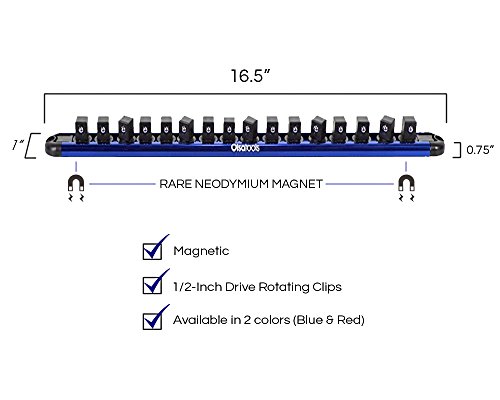Olsa Tools | Magnetic Socket Rail | 1/2" Drive Rotating Clips | Blue Aluminum + Black Clips | Made with rare neodymium magnet