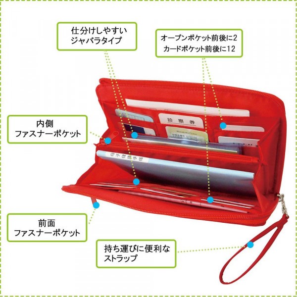 | 仕様 | カード収納枚数:12枚 オープンポケット:2つ ファスナーポケット:2つ ジャバラ式ポケット:1つ(2室) |