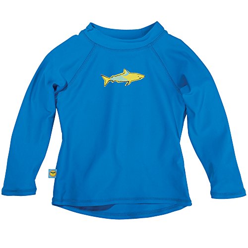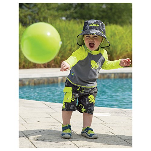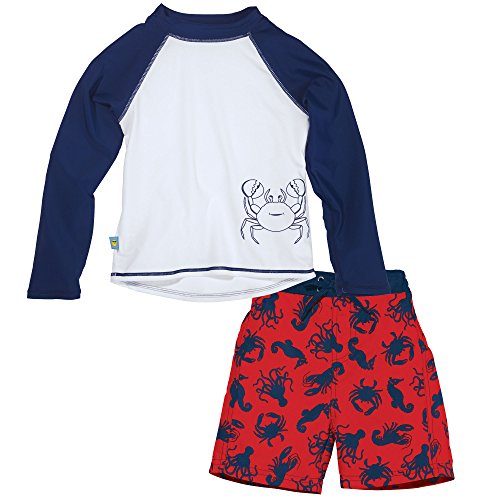 -. Binding : Misc. -. Brand : One Step Ahead -. Department : baby-boys -. Feature : The perfect swimming outfit for your baby boy: a swim diaper that meets the health standards of all public pools, and rash guard that provides maximum UPF 50+ upper body protection from harmful UV rays / The sleek and stretchy fabric is a premium-grade, high-tech nylon/elastane blend that is chemical-free, non-chafing, and quick drying, perfect for sensitive skin, keeping him cool in the sun and warm in the water / Premium safety and design features of rash guard include: extra protection with longer back, angle-cut cuffs, and generous stand up collar; double-stitched seams for maximum durability; and superior chlorine and saltwater resistance / Built-in swim diaper is made of hygienic coated polyester with covered, non-chafing elastic edging; upgrades include side or back pocket with velcro flap closure and grommetted drain holes, elasticized waist band with front tie drawstring / Will last all season and maintain its shape; practical, safe, comfortable, and stylish earning them their name of One Step Ahead; don't settle for second best -. ProductGroup : Apparel -. ProductTypeName : SWIMWEAR -. Title : Sun Smarties Baby Toddler Boys Long Sleeve Rash Guard and Swim Diaper Trunks