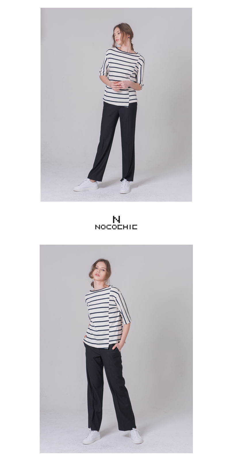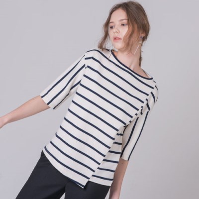 - 독특한 사선 커팅 디테일과 언밸런스한 스트라이프 배치로 캐쥬얼한 감성을 담았습니다.