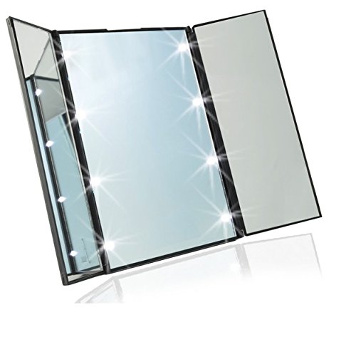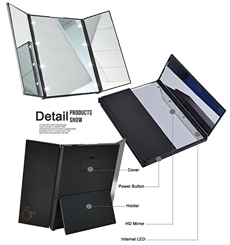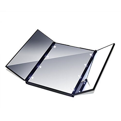 Illuminated Mirror:Mirror LED light powered by CR2032*2 battery.Tri-fold design enable you make up to see much more angle of your face than normal mirror.What's more, it is built with 8 led light on the circle of main mirror, lighting up your face clearly to perfect makeup.