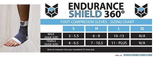 -. Feature : COMPRESSION TECHNOLOGY: Engineered compression foot sleeves to provide superior relief of plantar fasciitis, heel spurs, arch pain, foot pain and discomfort. Optimal support for muscle endurance and ultra-fast recovery. / LIGHTWEIGHT MATERIAL: Professional grade material (nylon & lycra blend). Designed for comfort and ultra-durability. Developed by athletes to relieve common foot pain and discomforts. / IMPROVE CIRCULATION: Precision support to provide optimal comfort and help improve muscular endurance. Designed to boost circulation so you can speed up your recovery times. / OPTIMAL SIZING: These compression foot sleeves are perfectly sized for men and women (please view chart on the right). / 100% BETTER THAN MONEY BACK GUARANTEE: If for any reason you don't absolutely love your Endurance Shield 360® compression sleeves, just return them and we'll refund every single penny or send you a replacement! This is our iron-clad, best promise in the industry guarantee!