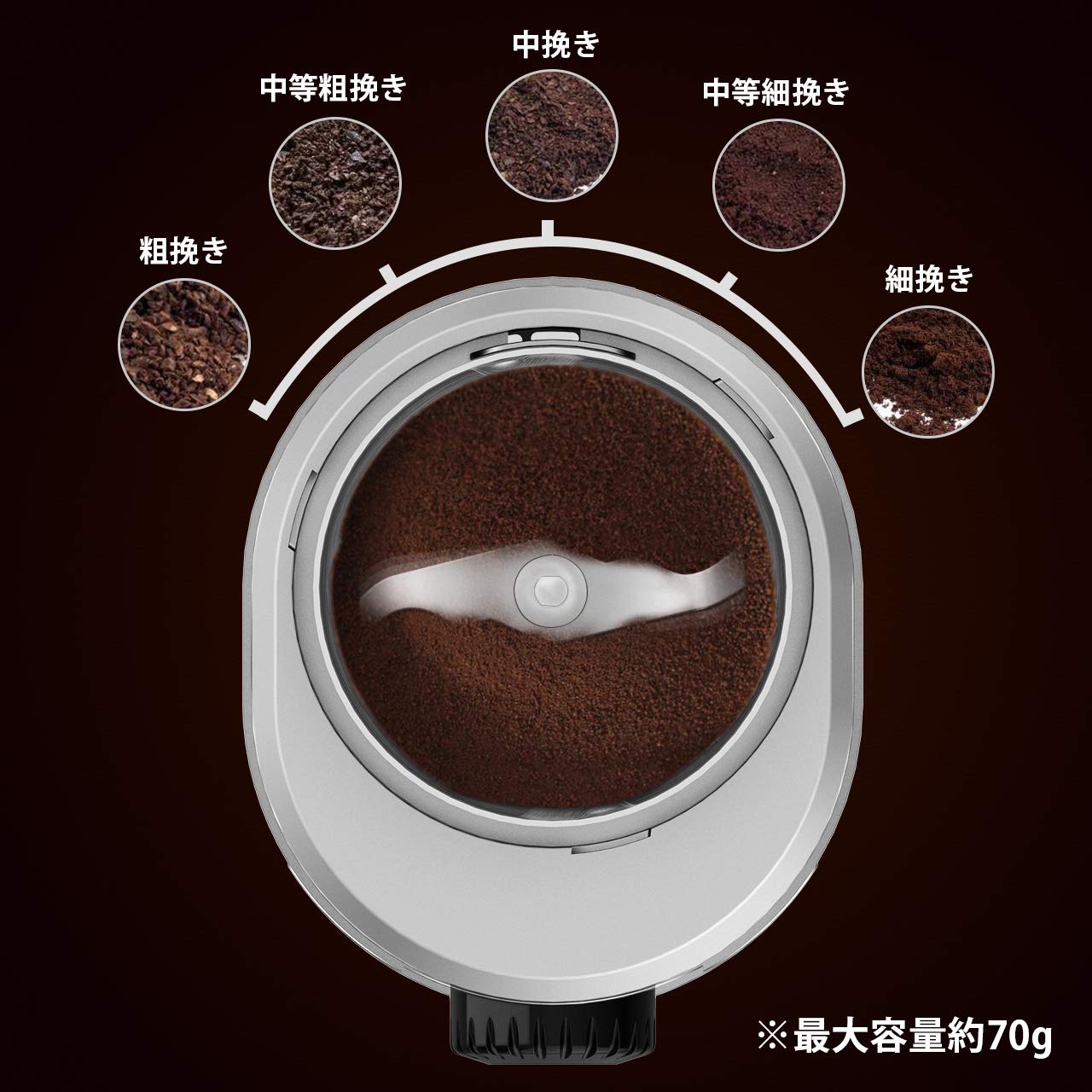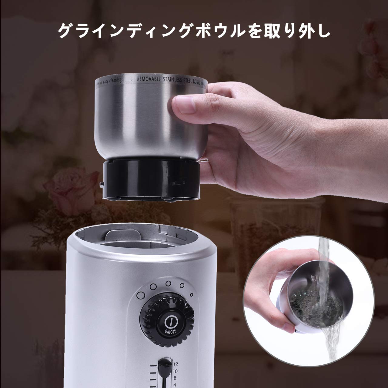 1.■【指一本の簡単操作】このコーヒーミルは電動コーヒーミルです。スイッチを押して、自動的に挽けます。設定した杯数分と粗さを挽いた後に自動的に停止する。杯数目盛ダイヤルと粗さ調節ダイヤルが付き、お好きのコーヒーを作ることができます。また、蓋が透明なので、コーヒー豆の挽き具合を確認やすいです。コーヒーを飲むのが好きな人にとっては必ず福音です。