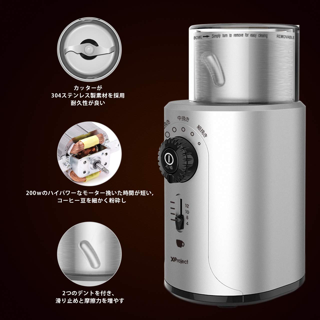 4.■【取り外せるホッパー便利】XProject電動コーヒーミルは304ステンレス製素材を採用して、耐食性、溶接性、機械的性質が優れている。ふたとグラインディングボウル取り外すことができるので、水洗いすることが出来ます。お手入れとても簡単です。