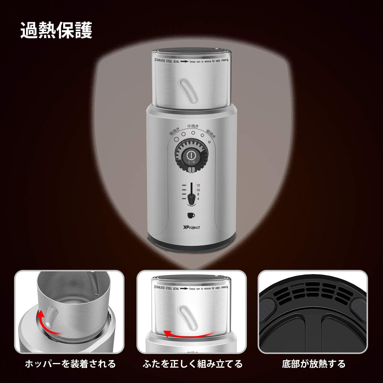 2.■【安全に配慮した設計】安全機能として、ホッパーふたが確実に閉まっていないと動作しない安全設計となります。ホッパーとホッパーふたの取り付け時,必ず時計回り回してください。カチという音がするまで取り付けが完了しました。ホッパーやホッパーふたの取り付けが間違っていると、電動コーヒーミルは働きません。また、過熱保護という設計もある、コーヒーミルの温度が高すぎると、電源が自動的に切断されます。複数の保護、いつでも安心して使うことができます。