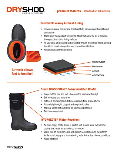Studio : DRYSHOD Publisher : DRYSHOD Binding : Misc. Product Description Extreme Conditions Winter Boot. Layers of warmth in a slim profile hug your feet and keep you warm and comfortable all day.DS1 molded outsole outer and inner grip6 layers of protection plus EVA cold-blocking midsole = 7 layers5.5 mm bootie 2.5 mm DENSOPRENE XD foam (extreme density) for extra protection 2 mm airmesh 2 mm warm fleece lining = 11 mm of insulating warmth and protection!Removable molded EVA socklinerDouble achilles heel and instep reinforcement for comfort and protectionNylon shankComfort Range: -50F to 65F 0