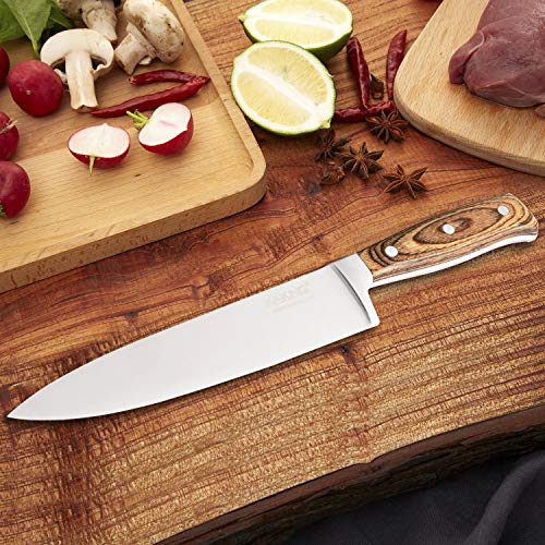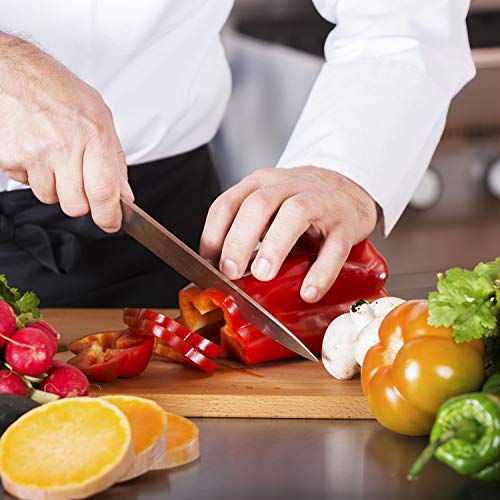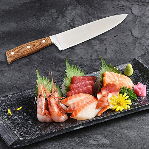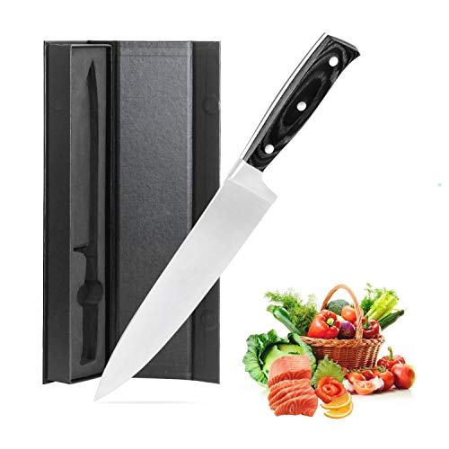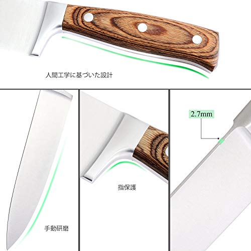 ドイツのシェフのナイフは強化された高炭素HCステンレス鋼で作られています。スチールブレードは、強度と耐久性を向上させるために、0.6%〜0.75%の炭素を含みます。 濡れた状態でさえも優れた錆および耐錆性。 工具の腐食および腐食を防止するために、クロム材料は16%から18%を含む。高品質のステンレス工具は、耐久性、耐摩耗性、タフでプロフェッショナルです。 優れた耐摩耗性と長持ちの快適性。 肉、魚、野菜、その他の食材を切ることもできます。 壊れにくいカボチャも簡単に切ることができます。