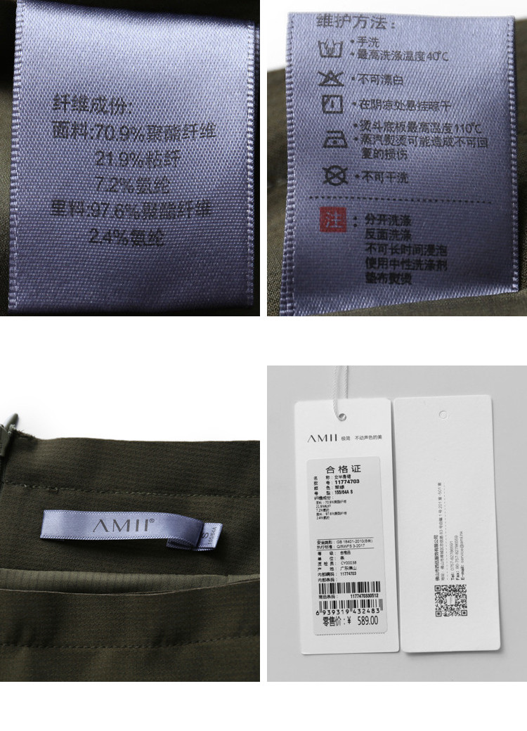 | 面料成分: | 面料:70.9%聚酯纤维,21.9%粘纤,7.2%氨纶 里料:97.6%聚酯纤维,2.4%氨纶 |