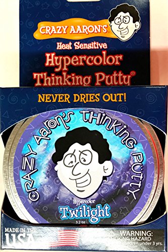 -. Binding : Toy -. Brand : Crazy Aaron's Thinking Putty -. EAN : 0688943128922 -. Feature : Hypercolor Thinking Putty / These Heat Sensitive Hypercolors really make their mark! / Hypercolor Thinking Putty is thermochromic -- just a touch from your hands or a warm coffee mug will reveal a new "hot" color. / Allow it to cool off or stick it in the fridge! Then the "cool" color will be restored. You can even do tricks with Hypercolor Thinking Putty! / Made in the USA! -. IsAdultProduct : 0 -. Label : Crazy Aaron's Thinking Putty -. Manufacturer : Crazy Aaron's Thinking Putty -. ProductGroup : Toy -. ProductTypeName : TOYS_AND_GAMES -. Publisher : Crazy Aaron's Thinking Putty -. Studio : Crazy Aaron's Thinking Putty -. Title : TWILIGHT HYPERCOLOR Heat Sensitive Crazy Aaron's Thinking Putty New lg 4" tin, Made in USA, Age 3+ -. UPC : 688943128922