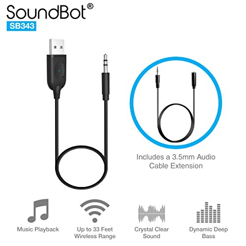 -. Feature : INSTANT TRANSFORMATION - SB343 turns the non-wireless car speaker system, classic stereo speakers, wired headphones/earphones, docking station, or home stereo into Bluetooth enabled devices to allow full spectrum crystal clear wireless music streaming from mobile phones, Android smartphones, iPhone, tablets, iPad, computer, laptop, TV, and all other music players ..etc. / CONTINUOUS PLAY, NO BATTERY OR RECHARGING REQUIRED - Equipped with built-in USB adapter cable to connect this Bluetooth receiver directly to the USB power source without any interruptions during playback and the need to recharge any batteries at up to 33 feet distance with free line of sights. / MODERN, CONCISE, PORTABILITY DESIGN - 1 foot (when extension cable is not used) cable length connects 3.5mm jack on one end right directly to the power source (USB port is REQUIRED in order to use SB343) on the other end of the cable to offer maximum portability and space without unnecessary lengthy and tangling wires. Comes with free 3 feet extension cable to increase the total length to 4 feet / PLUG AND PLAY - NO BUTTON TO CONTROL - Enters the pairing mode automatically. Once the Bluetooth enabled player device is paired, the receiver will be always-on for continuous music streaming as long as USB power source is on. UNIVERSAL COMPATIBILITY - forward and backward compatible to all forward and backward generations Bluetooth standard enabled devices. / SATISFACTION GUARANTEED - Including 100% risk-free & hassle-free warranty to offer you peace of mind for purchases made from authorized dealers. 18 extended warranty program available with valid product registration.