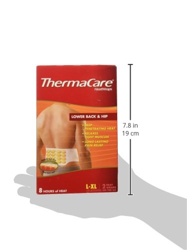 -. Binding : Health and Beauty -. Brand : ThermaCare -. EAN : 0305733010631 -. Feature : Relaxes tight muscles with long lasting pain relief for up to 16 hours / 8 hours of heat while you wear it, plus 8 hours of relief after you take if off / Ultra thin, comfortable, discreet and odorless with deep penetrating heat. / Size: L-XL -. IsAdultProduct : 0 -. Label : Thermacare -. Manufacturer : Thermacare -. Model : H&PC-00088 -. MPN : H&PC-00088 -. PackageQuantity : 1 -. PartNumber : H&PC-00088 -. ProductGroup : Health and Beauty -. ProductTypeName : HEALTH_PERSONAL_CARE -. Publisher : Thermacare -. Studio : Thermacare -. Title : Thermacare Back & Hip Heat Wraps - 6 ct. -. UPC : 305733010631