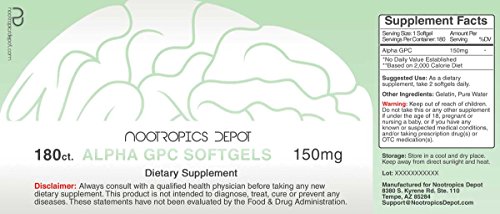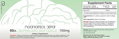 -. Binding : Health and Beauty -. Brand : Nootropics Depot -. Feature : Alpha GPC 99% Capsules | 150mg Softgels / Nootropic Brain Booster / Choline Supplement / Supports Brain Health, Memory and Focus / In-House Lab Tested for Purity and Identity -. IsAdultProduct : 0 -. Label : Nootropics Depot -. LegalDisclaimer : Always consult with a qualified health physician before taking any new dietary supplement. This product is not intended to diagnose, treat, cure or prevent any diseases. These statements have not been evaluated by the Food & Drug Administration. -. Manufacturer : Nootropics Depot -. ProductGroup : Health and Beauty -. ProductTypeName : HEALTH_PERSONAL_CARE -. Publisher : Nootropics Depot -. Studio : Nootropics Depot -. Title : Alpha GPC 99% Capsules | 150mg Softgels