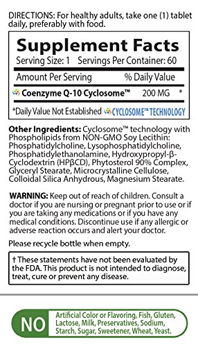 Each serving (1 Tablet) contains 200mg of CoQ10 with Advanced CyclosomeTM Liposomal Delivery Technology for maximum bioavailability and better absorption than Ubiquinol.