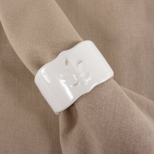 This earthenware napkin ring carries a fleur de lis design, a symbol of the bounty, sweet rewards and the soft easy days of summer in the country. Approximately 3 inches. White.