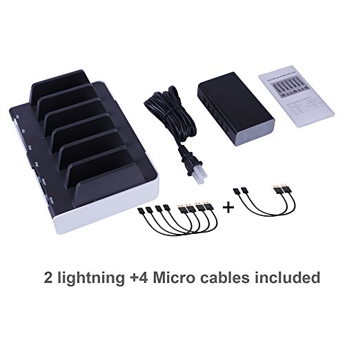 What you will get: 1x6-port USB charger, 1x6-slot charging station, 2xlightning cable, 4xmicro cable (No support USB data transmission), 1xpower cord, 1xuser guide. We also offer 12 months warranty and outstanding customer services.