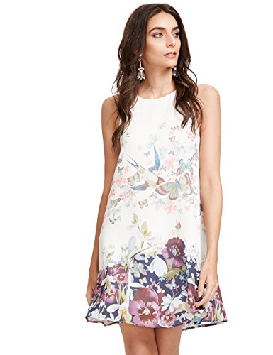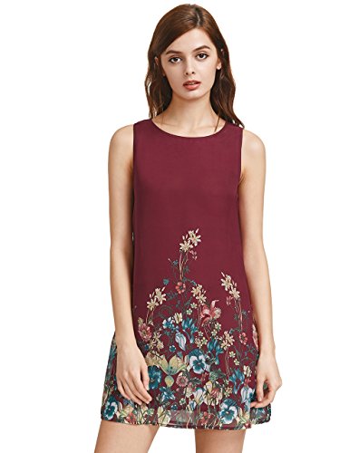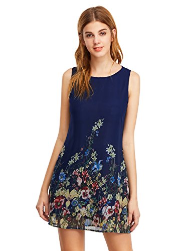 Sleeveless, floral print, flower pattern, lined, above knee high. Shape: narrow top, loose bottom.