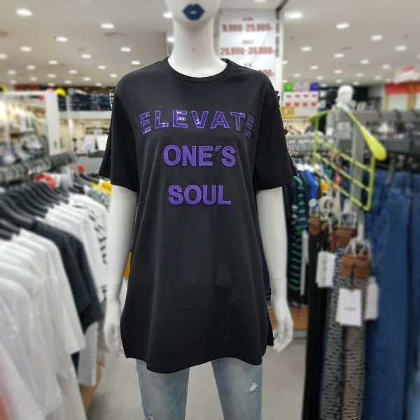 여성용 뒷트임 레터링 반팔 티셔츠 입니다^^앞면 레터링 프린트에 스팽글장식으로 여성스럽고 더욱 세련된 디자인이며 살짝 롱기장과 루즈 핏으로 나와 편하게 착용하기 좋습니다.뒷 라인엔 과감한 트임 포인트를 더해주어반전뒷태룩을 연출해주어 은근 섹시하답니다^^
