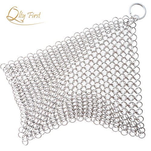 SUPER SALE Qlty First Cast Iron Cleaner - Made of XL 8x6 / 7x7 Inch Premium Stainless Steel Chainmail Scrubber, Includes a hook and a Dish Drying Cloth
