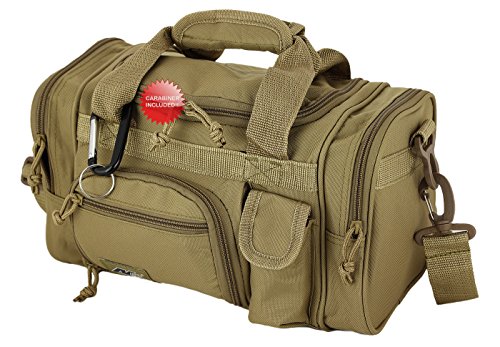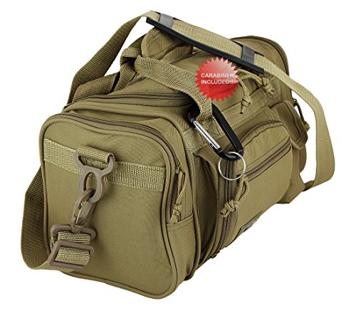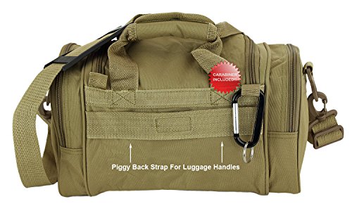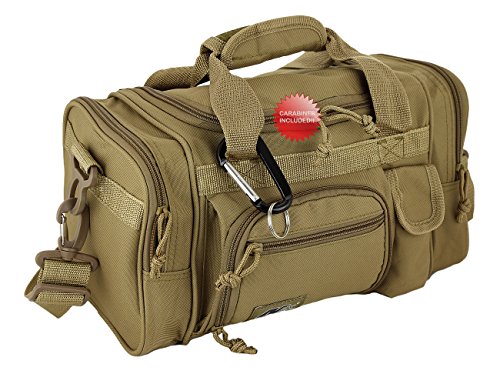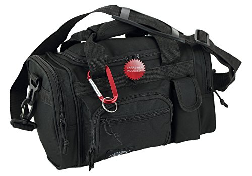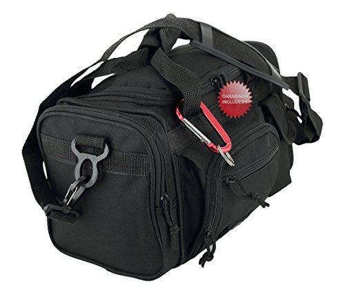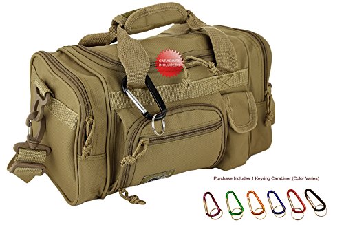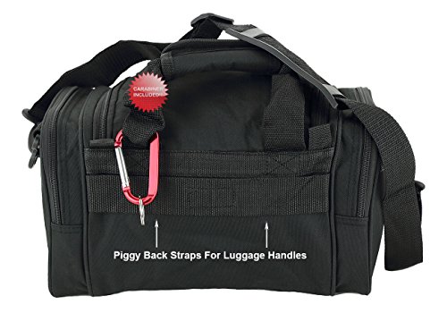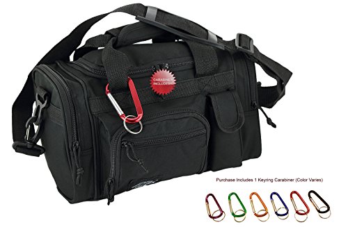 Purchase Includes: Key ring carabiner (colors vary) Features: 13 in duffels meets airline carry on guidelines (all duffels larger than 22 inches cannot be used as a carry on per airline restrictions): can take it on the plane with youConstructed of 600D polyester that provides durability and longevity under daily use Pockets are lined with PVC that provide water repelling protection from the elements, so your gear stays dry in wet weather2 front zippered front pockets, 2 zippered side pockets, 1 velcro closing pocketDual zippered U-shaped opening main compartmentMain compartment floor board to stiffen the bottom side2 carry handles have a Velcro wrap-around strap to form one main handle for easier handlingZipper rope pulls: easily replaceable if neededRemovable and adjustable shoulder strap comes with sliding flexible rubber shoulder pad and extends up to 40 inchesColor options: Black, TanMade in ChinaComes with Manufacturer's Limited Lifetime Warranty: buy with confidence!