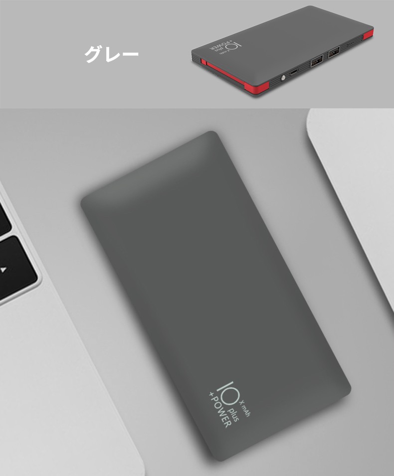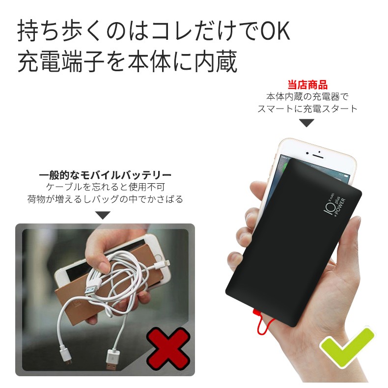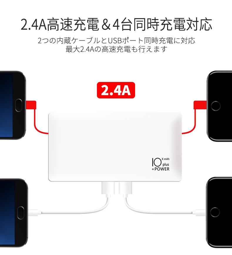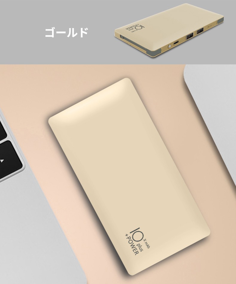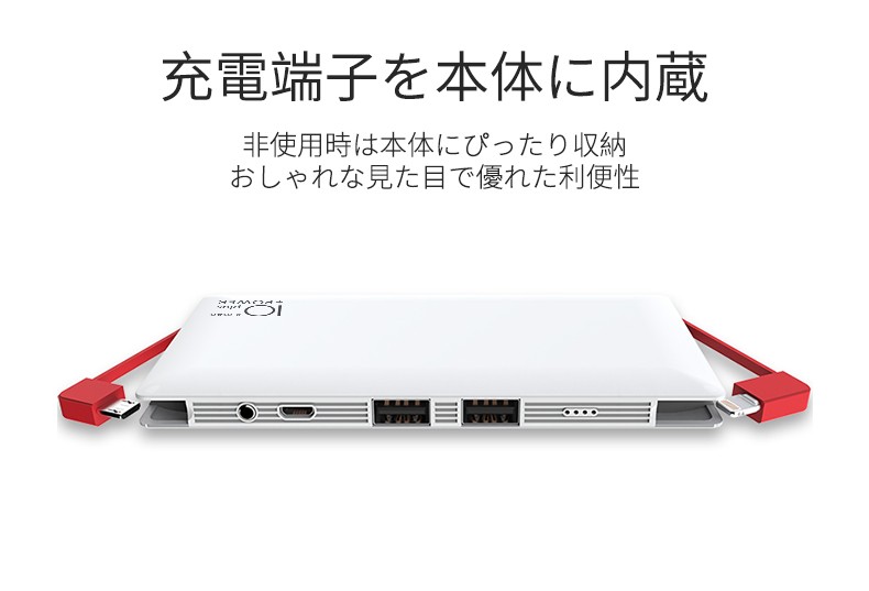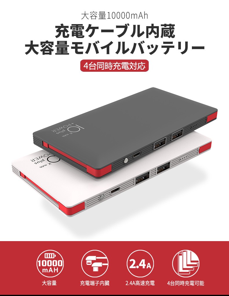 薄型超軽量でケーブル内蔵の大容量モバイルバッテリー登場!カラー・ゴールド・ローズゴールド・ブラック・グレー・ホワイト【 10000mAh超大容量モバイルバッテリー 】10000mAhの大容量ながら薄さは12.8mm、重量たったの210g使う場所を選ばないシンプルコンパクトデザイン4台同時出力にも対応でこれ一台で身の回りのありとあらゆる機器を同時に充電!しかも高速充電にも対応【 各種充電ケーブル内蔵 】オシャレな見た目に隠れた便利機能!iPhone充電端子、MicroUSB-B端子それぞれを本体に内蔵しケーブルの煩わしさから開放!※USB Type-C対応機種の充電には、別売りの変換アダプターが必要です。もうケーブルを別に持ち歩く必要はありません。これさえあればSoftbank,docomo,auなどの国内キャリアを含めたXperia,Huawei,ASUS Zen Fone,Galaxy,iPod...etc数多くの機種に充電する事が可能になります。